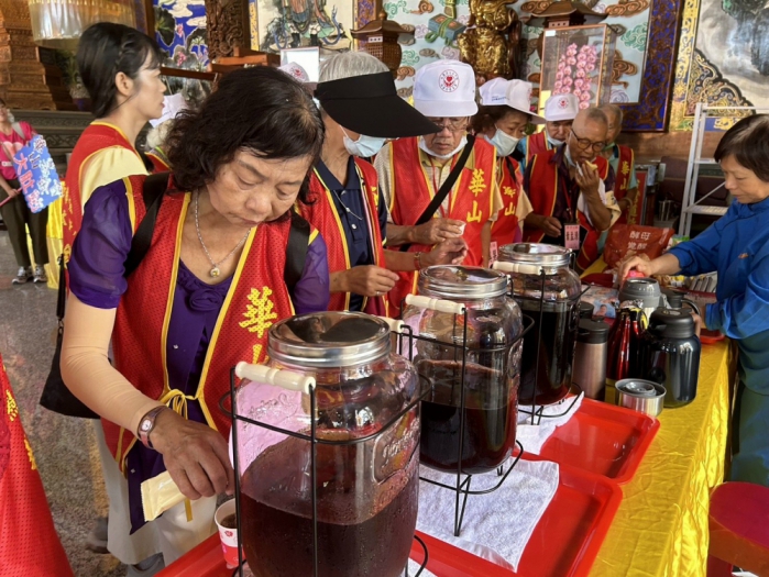 華山基金會台中市各區天使站舉辦【百老祈拜進香團GO 護佑孤老平安健康】活動,有長期照護的二百餘位長輩參加,由區站長曾育群、台中總部B區市站長梁偉宇率領,整隊出發後即,沿途到東區樂成宮、豐原鎮清宮、清水紫雲巖參拜,於上午十時三十分再抵達外埔無極三清總道院觀音佛祖殿,先品嚐廟方準備的香味四溢的咖啡、傳統小吃,因有的長輩行動不便,但華山及廟方志工細心的問及想吃或喝點什麼後,再為服務,凸顯對長輩關愛之意。