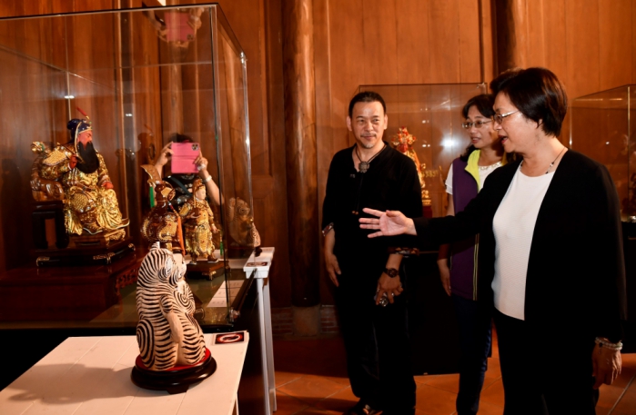 王縣長指出,柯錦中老師於西元2012年(民國101年)獲台灣工藝之家殊榮,2016獲縣府登錄無形文化資產的傳統工藝,粧佛技術保存者,今年2024年獲縣府登錄無形文化資產-傳統工藝-神明紙帽保存者,曾任第5屆台灣工藝之家協會監事、台灣頂級工藝協會第1屆常務理事,柯老師不僅製作傳統佛神像,近年更從古法中改良,運用當代材料,投入現代雕刻創作,讓傳統工藝有創新傳承。