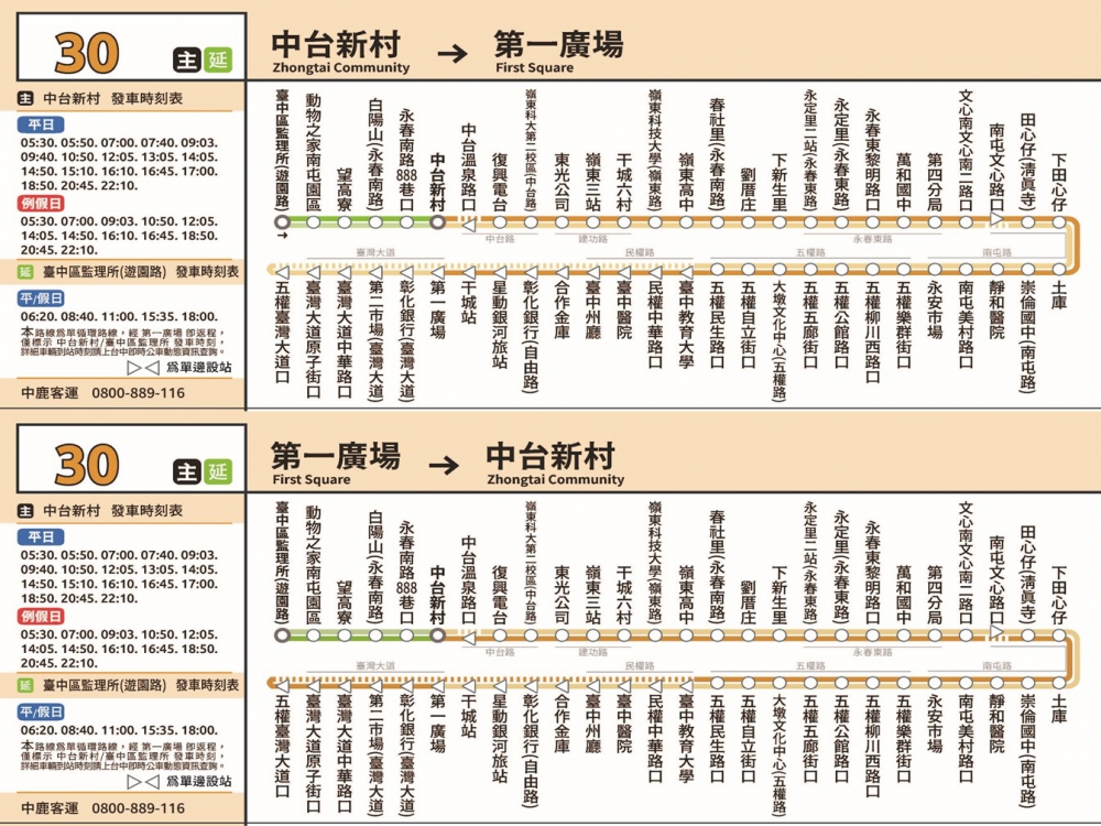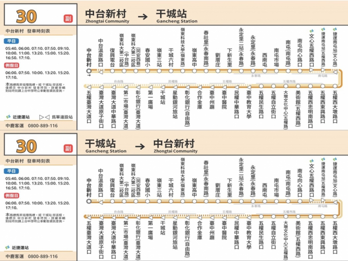 交通局提醒,30、30副、30延路線將於7月1日起正式實施,其中30路提供平日18車次(36班次),假日12車次(24班次)服務,相關乘車資訊可到「台中市即時公車動態資訊」網站( http://citybus.taichung.gov.tw/ebus ),或到交通局官網( https://is.gd/MTPvdg )下載「台中公車APP」查詢,掌握即時公車資訊,包含公車路線行經的站點、發車與到站時間。