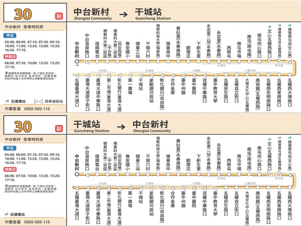 為讓運輸資源有效分配,此次規劃將兩條路線班次聯合排班並進行路線整併,以30路為主體,40路調整為30副,其中30副改以單循環方式,提供平日12車次(等同24班次)、假日6車次(等同12班次)服務,而延伸台中區監理所的30延則維持原名稱。