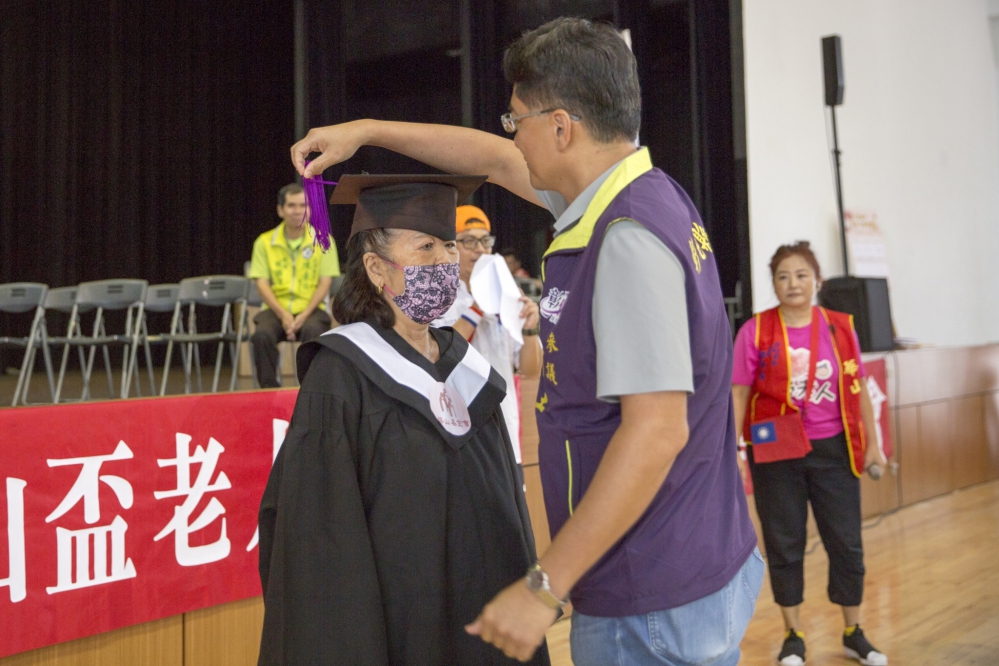 賴阿嬤除代表長輩宣誓外,並成功挑戰五關卡,象徵完成學業,阿嬤穿上學士服,由參議柯呈枋撥穗,一圓就學夢想。