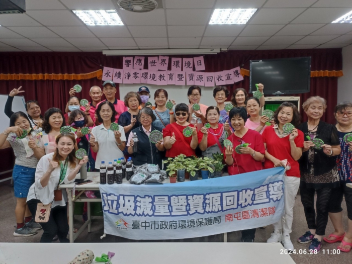 【記者林獻元台中報導】台中市政府環保局永續淨零環境教育宣導列車28日開往南屯老街,與南屯里辦公處一同推廣永續淨零環境教育理念。環保局長陳宏益表示,配合2024世界環境日主題「恢復土地生機、終結沙漠化、守護水安全」,響應守護地球環保行動,南屯區清潔隊特別推出環境友善3寶(小綠植栽、青草液肥及培養土),除進行環保宣導,也透過選舉布條回收變隔熱墊DIY教學,實踐環境教育理念及環保行動,灑下綠色種子。