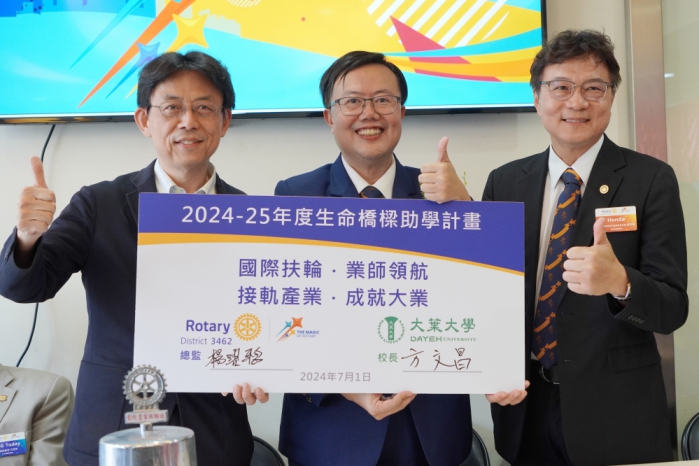 楊曜聰說,大葉有豐沛產學能量,為企業最佳夥伴,「生命橋樑助學計畫」,將與大葉通識課程合作,由扶輪社友擔任學生業界導師,幫學生了解職場挑戰,提前準備職涯,接軌產業,提供獎學金,鼓勵優異學生,期盼業師領航,帶領學子成就大業。