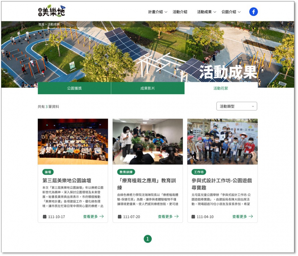 此外,網站也提供豐富的公園活動介紹、工作坊、說明會及公園獲獎成果,期許透過強化市民參與互動,逐步打造「富市台中,新好生活」願景。
