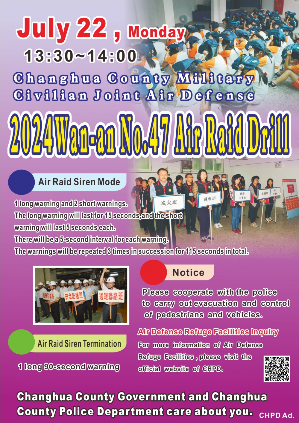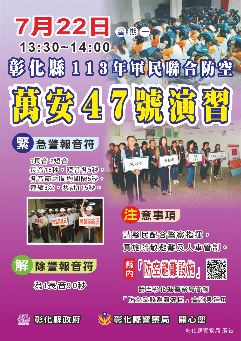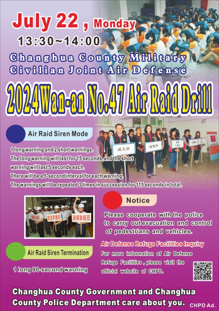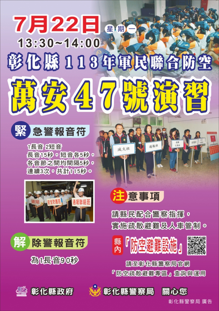 〔記者周為政彰化報導〕彰化縣「113年軍民聯合防空(萬安47號)演習」,訂本月22日(星期一)下午1點半至2點實施30分鐘,演習項目有「警報傳遞與發放」、「疏散避難」、「交通管制」和「其他必要管制(關閉門窗、熄滅燈火、音響)」等。