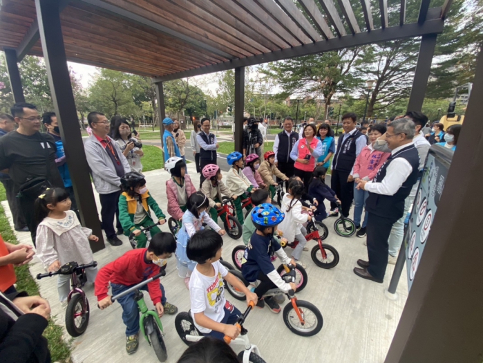 中市東區泉源兒童交通主題公園,讓小朋友騎乘滑步車一起學習交通知識,也讓多元的公園讓孩童玩得盡興又安全。 -