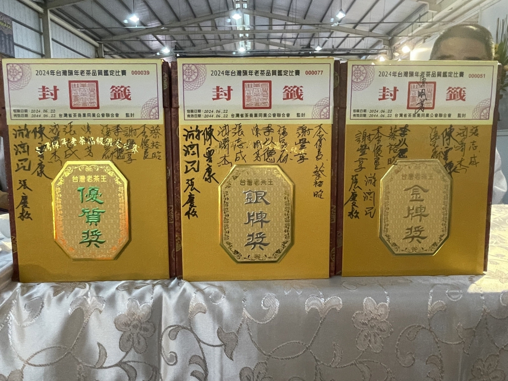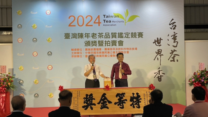 【記者林獻元台中報導】由中華民國茶商業同業公會全國聯合會主辦,台灣省茶商業公會聯合會所協辦執行「全國2024年台灣陳年老茶品質鑑定」,13日在烏日展覽館「2024臺中國際茶、咖啡暨烘焙展-台中展區」進行現場拍賣競標,最終金牌獎以一斤25萬元由揚茗茶業行李俊良搶標成功,銀牌獎則標出一斤8萬元,優質獎為一斤6萬元。優質獎標價比去年提高一萬元,喝老茶風氣漸漸形成。