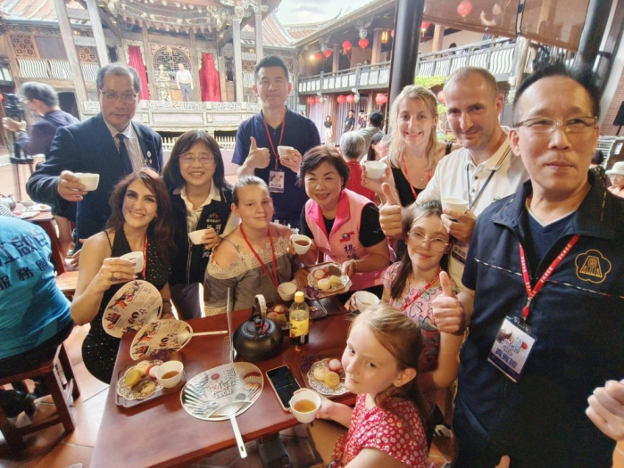 活動現場,更有來自法國的李喬(Mr. Jonathan Tartare)與妹妹胡賽爾·婕西(Miss Jessy Roussel)及三位千金,以及日本的Kitadono Yoshio教授、伊朗的Suzzan(蘇珊)教授也受邀出席,一同體驗午茶觀光的文化饗宴。李喬品嚐法國未有的椰絲糕點,外鹹內甜的口感讓他感到相當驚艷,首次造訪宮保第的Suzzan教授也覺得在古建築裡體驗台灣文化非常棒。