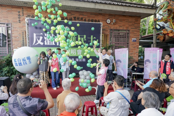 【記者林獻元台中報導】近期藍白聯手通過立法院擴權法案,造成全台許多民眾不滿,民進黨市議員陳俞融今14日下午舉辦「反濫權護民主」說明會,吸引超過5百位鄉親熱情參加,擠爆會場。說明會中充滿巧思,藉由戳破象徵藍白謊言的巨型氣球,釋放出大量代表民主遍地開花的綠色小氣球,畫面壯觀。此次也是有意參選台中市長的立委何欣純在市區的說明會,許多民眾爭相和何欣純合照,人氣高漲。