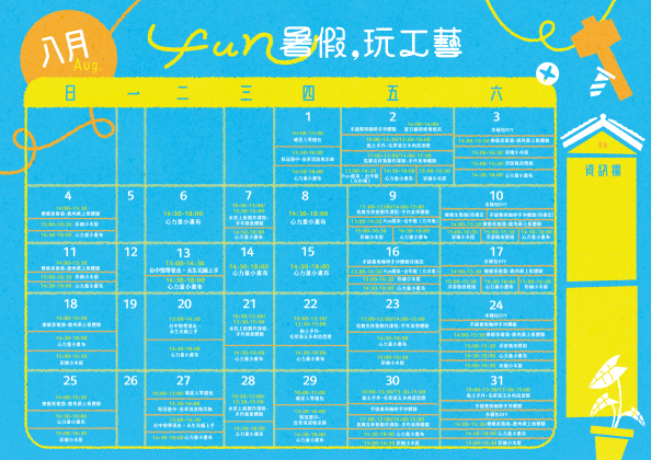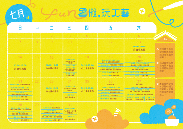 勞工局說明,「藝同FUN暑假」活動分為三個主軸,第一主軸為「FUN暑假,玩工藝」,依據課程難易度分為「藝同味童趣」、「藝同玩創意」、「藝同品生活」等三大主題,集結審計新村青創基地店家心內畫、貳囍樓及光復新村蒾蕗花草選物店、日常Life手屋、尋覓家香、CORAL皮革手作、Amy Ting's藝想世界、吾革事、溫咖好、巍峨木業、復千金等12間摘星店家,帶來編織、皮革、植栽、花藝等有趣又好玩的工藝手作體驗,並推出課程早鳥優惠以及獨家抽獎資格,歡迎民眾聯繫店家報名。