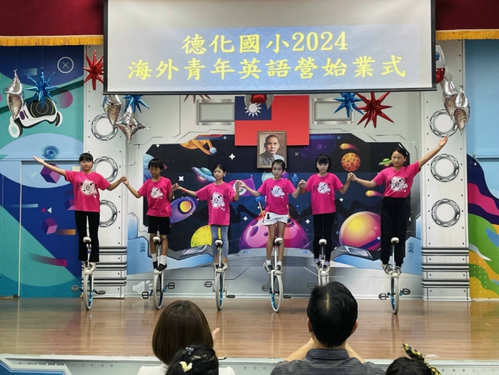 德化國小教育部海外青年英語服務營昨日正式開幕,由教練劉虹莉老師率領獨輪車隊小騎士們,以精湛的團體花式表演迎接六名來自美國、加拿大和越南國際學校的海外青年志工,學生團隊整齊、活潑又能分列式之精湛的獨輪車表演,令海外青年志工隊讚嘆不已!