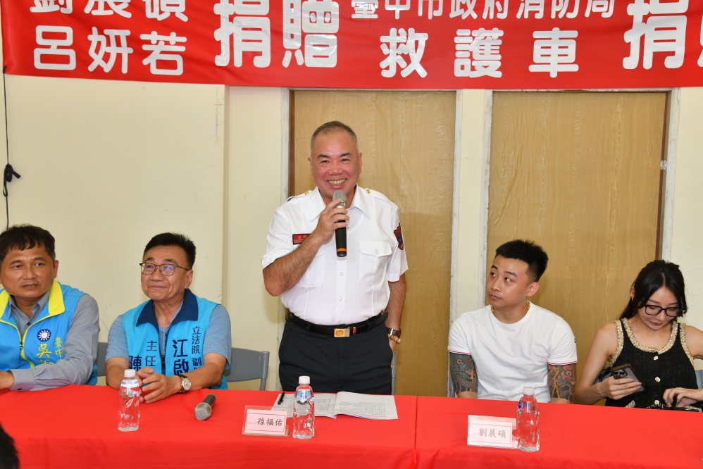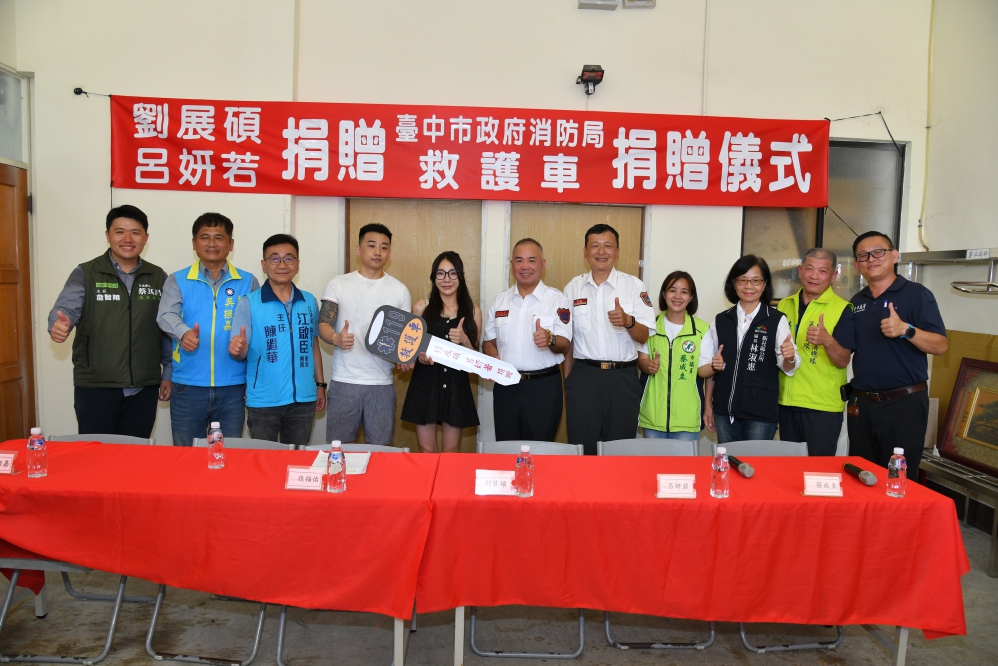 消防局長孫福佑指出,劉展碩、呂妍若夫婦及父親劉曜瑋、母親鄭詠方是台中市優秀市民,他們在新聞報導中看到善心人士捐贈救護車義舉,也想盡己所能回饋社會、積德行善,新社地區有許多產業道路,路況崎嶇,