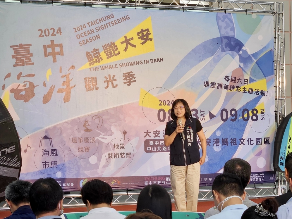 陳美秀說明,「2024台中海洋觀光季」活動日期從8月3日至9月8日,歡迎來大安港媽祖文化園區欣賞地景藝術,每週六日在大安港媽祖文化園區還會舉辦海風市集、主題音樂會,今夏的大安在每週六日都是精采狂歡日,更是炎炎夏日的好去處。