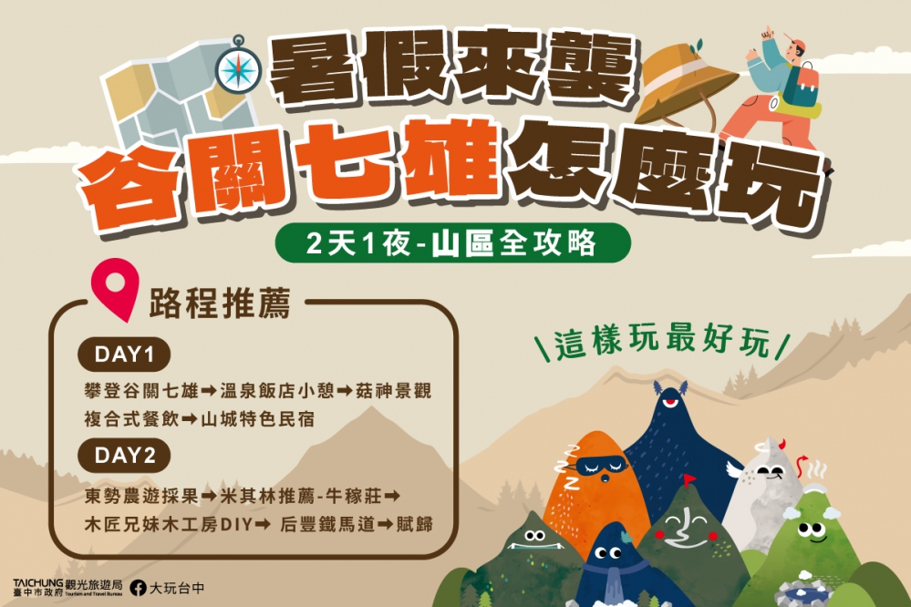 玩法1,「2天1夜山區全攻略」,第一日安排攀登谷關七雄,結束後到谷關泡湯小憩,接著到新社區菇神景觀餐廳飽餐,並入住當地民宿,第二日來到東勢區採果,午餐推薦當地米其林美食東勢牛稼莊,餐後到木匠兄妹進行木作DIY體驗,最後在后豐鐵馬道迎夕陽吹風騎單車。
