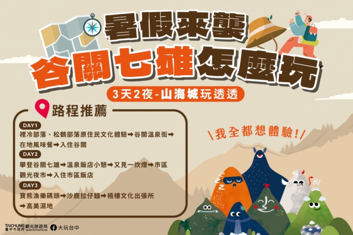 玩法4為「山海城玩透透」,第一日到裡冷部落、松鶴部落體驗原住民文化,接著安排谷關溫泉街體驗日式風情,並入住谷關特色旅宿,第二日攀登谷關七雄,至溫泉飯店小憩後,到新社區特色餐廳又見一炊煙品嘗小點,接著到市區觀光夜市吃美食,晚間入住市區飯店,第三日則可沿路玩到海線追落日,台中山海城各有風貌、好玩好吃一次滿足。