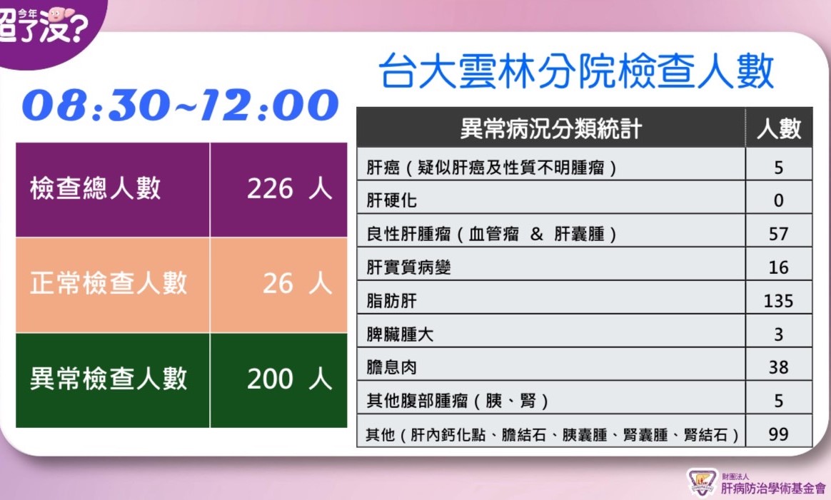 內科部肝膽腸胃科李基裕主任指出,本次活動共動員30餘位醫護及行政人員協助,現場由郭家旗醫師、邱敏欽醫師、余健鈞醫師及楊宗樺醫師為民眾進行專業腹部超音波檢查及判讀。雲林縣共有226位民眾參加檢查,其中篩檢出肝臟腫瘤5位、良性腫瘤(血管瘤及肝囊腫)57位、膽息肉38位,多數個案都有脂肪肝問題。