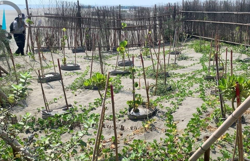 植物初期由竹筒保護,未來將與在地協會合作進行澆水,期望能提高植生的存活率及蔓延範圍,為外傘頂洲編織一張綠色的固沙網。(圖/自然保育署南投分署提供)