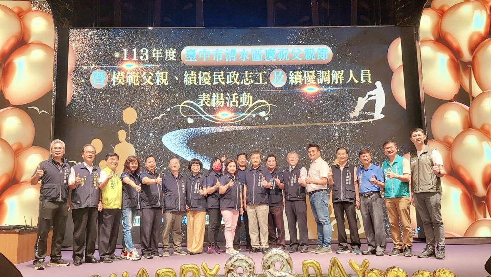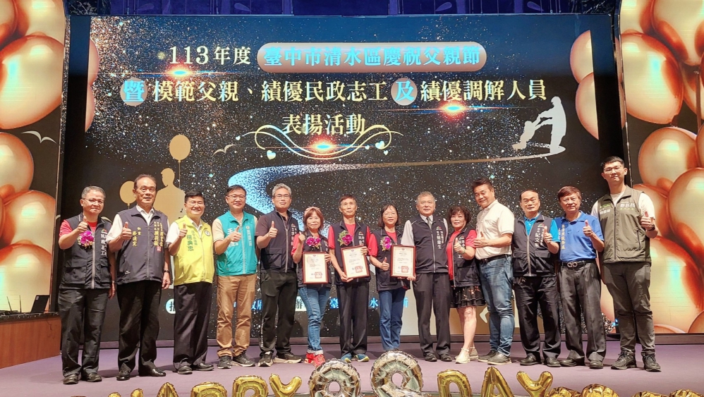 【記者楊川欽台中報導】父親節即將到來,為感謝清水區模範父親為家庭奉獻與付出,清水區公所特別規劃於27日舉辦「113年度台中市清水區慶祝父親節暨模範父親、績優民政志工及績優調解人員表揚活動」,共有35位模範父親、3位績優民政志工及14位績優調解人員接受表揚,中市府運動局長李昱叡與區長蔡慶生向每位模範父親獻上真誠的祝福,現場溫馨熱鬧。
