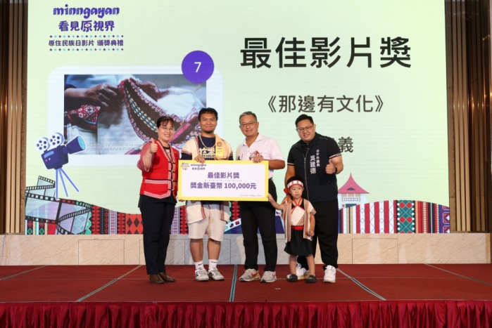 楊馨怡進一步指出,今年總獎金高達35萬元,共45人踴躍參賽,從28件參賽作品中選出8部得獎作品。最佳影片由《那邊有文化》獲得獎金10萬元;《技•憶》呈現祭典前的部落準備工作,有別於祭典紀錄,獲得評審團特別獎;主題傳達獎則由《小米媽媽》獲得,各頒獎金5萬元。