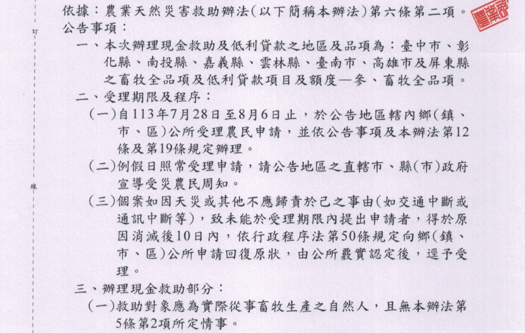 凱米颱風畜牧全品項之農業天然災害現金救助地區,自7月28日起至8月6日止受理申請,周末期間仍可前往受災地公所辦理。