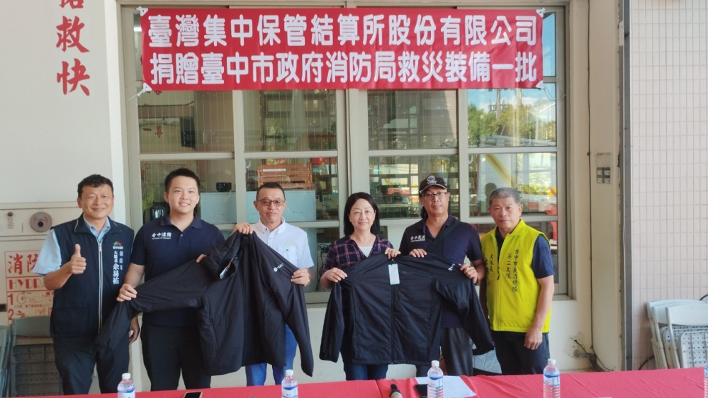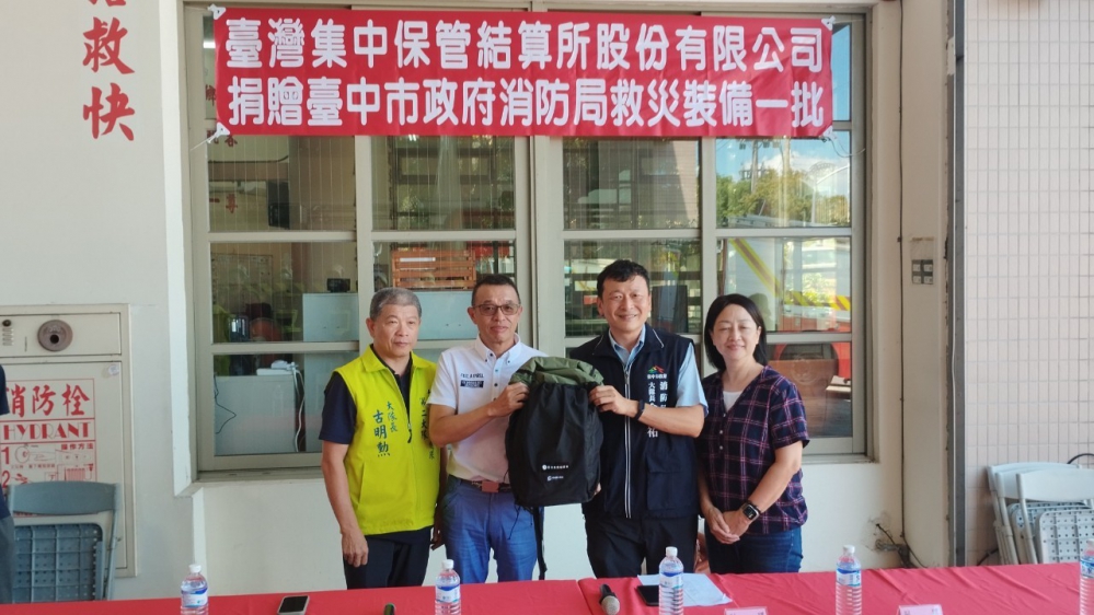 消防局第二救災救護大隊長余易祐表示,政府資源有限,民力無窮,由衷感謝「台灣集中保管結算所股份有限公司」對於消防工作的肯定,無私捐贈極輕量登山背包150套、多功能連帽防潑水外套36件及連帽彈性化纖保暖外套36件,有效提升消防救災能量,進一步守護市民生命財產安全,為台中市打造為安心、放心、更優質的生活城市。