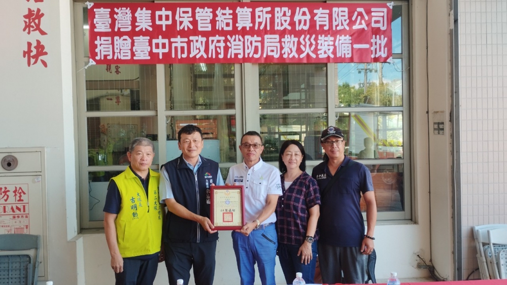 【記者林獻元台中報導】為節省救災人員體力,提高救災效能,「台灣集中保管結算所股份有限公司」熱心捐贈台中市政府消防局救災裝備。捐贈儀式2日在消防局第二救災救護大隊舉辦,由該隊大隊長余易祐接受捐贈並頒發感謝狀。消防局表示,政府資源有限,民力無窮,感謝該公司對消防工作的肯定及無私捐贈,共同守護市民安全。