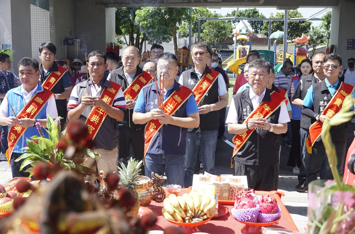麥寮鄉興華繪本館揭幕啟用前,麥寮鄉鄉長許忠富擔任主典官率眾人祭拜。