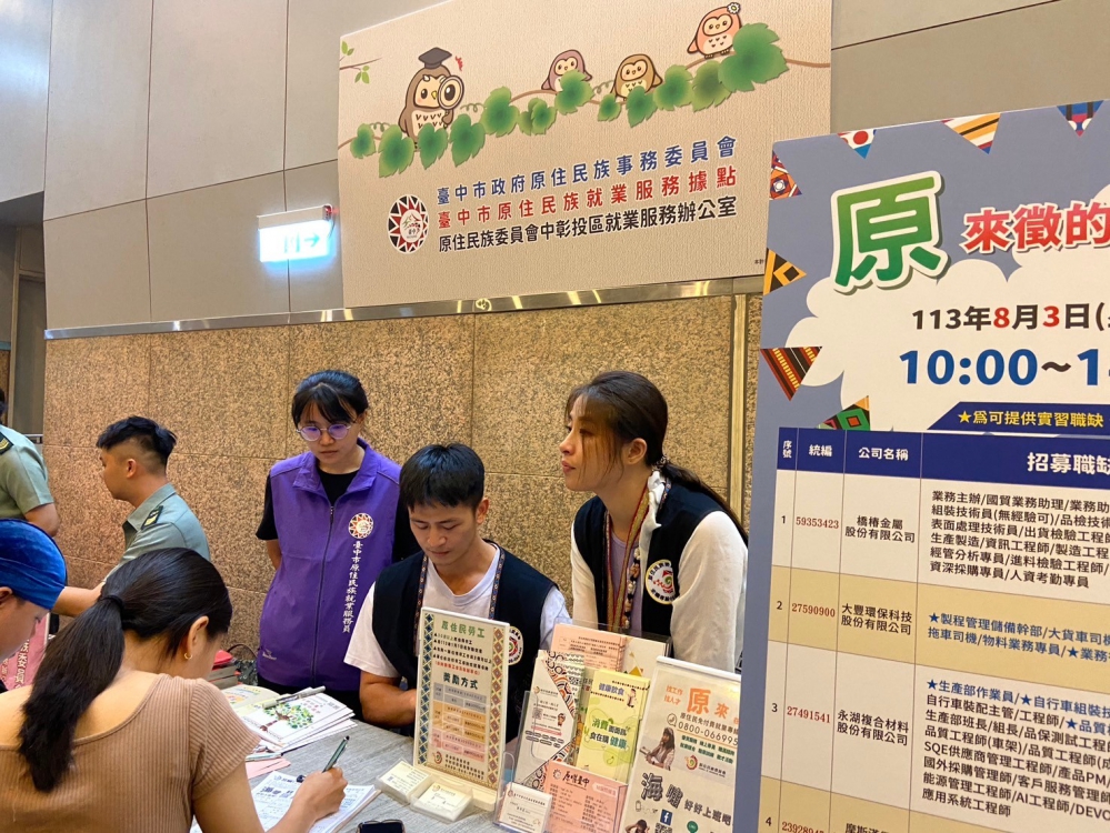 市府原民會主委楊馨怡指出,就業徵才現場包含王品餐飲股份有限公司、全家便利商店、橋椿金屬股份有限公司、永湖複合材料股份有限公司、賽那美集團(清新溫泉飯店、霧峰高爾夫球場)、馡曄國際股份有限公司、大豐環保科技股份有限公司、摩斯漢堡等8家知名企業釋出總計478個職缺。