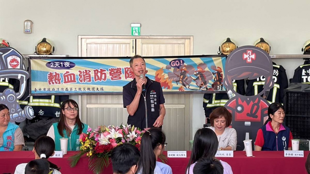 消防局第三大隊副大隊長程建勳於營隊開場時勉勵小學員,放開心胸學習新的事物,消防安全教育觀念從小扎根學習。