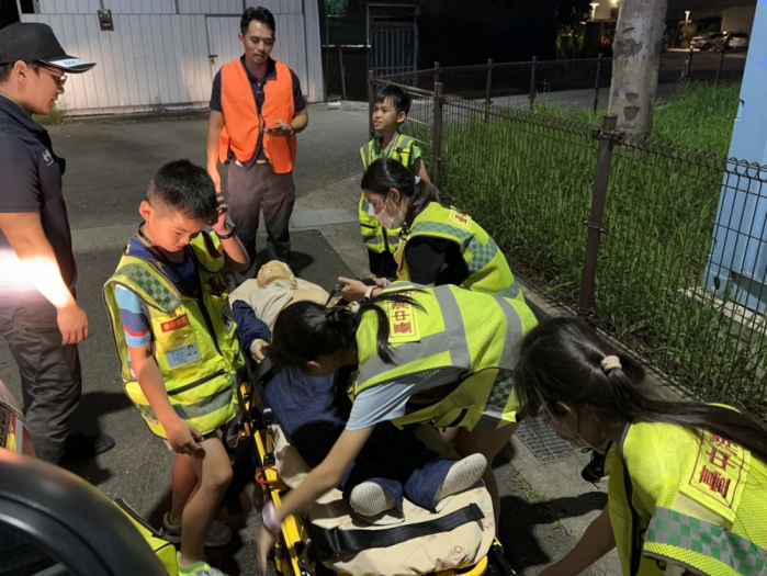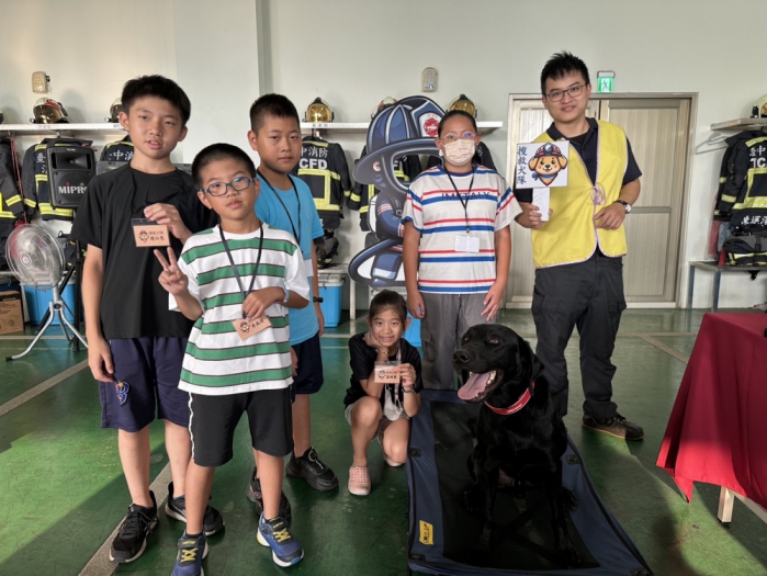 另還有設計警鈴緊急集合情境,讓學員著小小消防衣,乘坐消防車出勤,並於安全狀態下進行救災救護的情境操作。