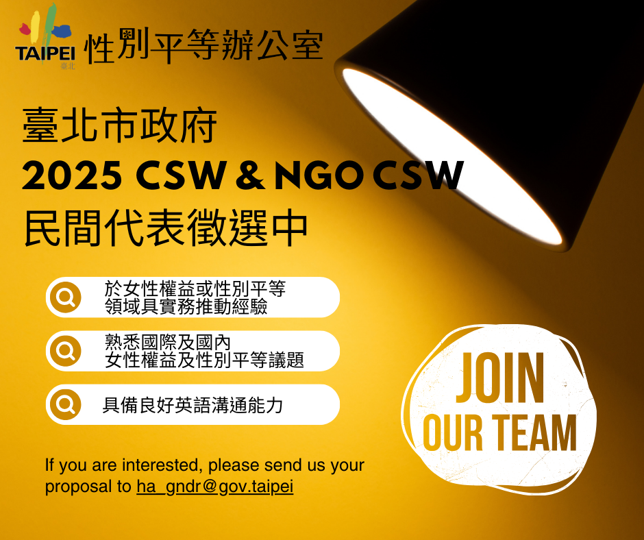 臺北市政府現正徵選2025年聯合國婦女地位委員會(CSW)及非政府組織婦女地位委員會(NGO CSW)民間代表1名。成功入選者將由臺北市政府補助其前往美國紐約參加上述會議的機票、食宿及主辦平行論壇相關費用。詳細的徵選計畫內容,包括徵選方式、時程、資格、執行內容及評選標準,請參閱臺北市性別平等辦公室官網的最新消息(網址:[連結])。