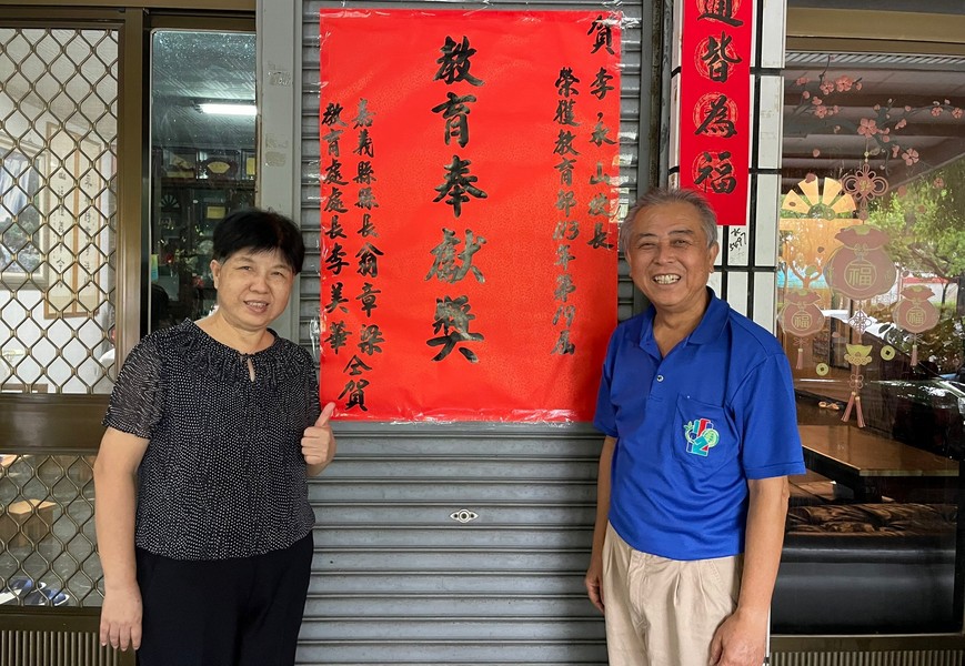 太保國小退休校長李永山榮獲教育奉獻獎,教育處長李美華代表縣長翁章梁到府貼榜祝賀。(圖/嘉義縣政府提供)