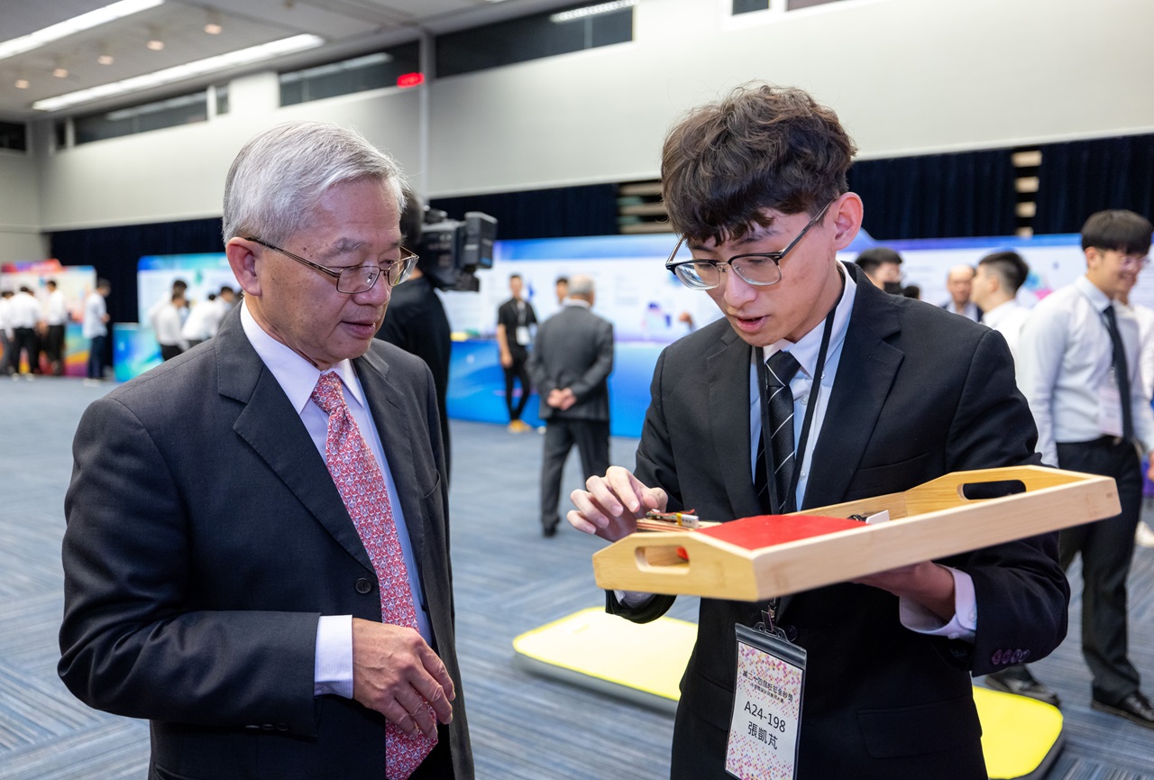 虎科大「AI智能互動桌球拍」獲獎團隊成員張凱芃(右)為國科會主委吳誠文介紹作品。(圖/國立虎尾科技大學提供)