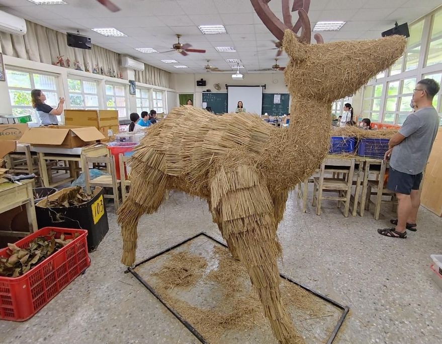 ▲玉山國中暑期食農營創作2米高稻草梅花鹿吸睛。(圖/玉山國中提供)