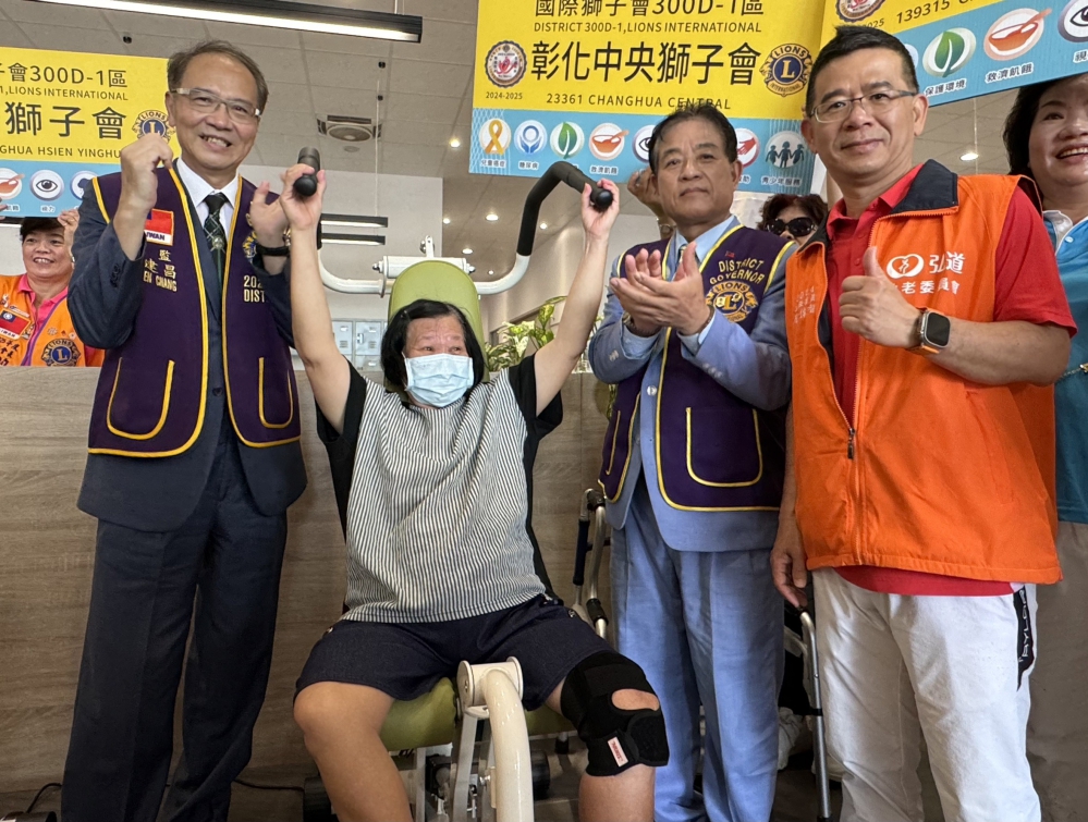 兩位總監在現場開箱這次添購的全新設備計劃,並以接龍方式,將照顧設備手牌,傳至弘道彰化助老委員會主委唐偉智手中,象徵將國際獅子會愛心和善意傳給弘道,兩位總監也陪中風失能的69歲﹁阿丁阿公﹂,體驗無障礙交通車的升降裝置,也陪伴66歲﹁水欗阿嬤﹂體驗等速肌力訓練器材,培養好肌力,預防肌少症。