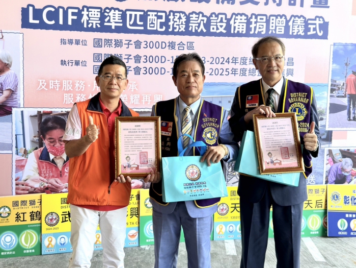 國際獅子會今(9)日在弘道福興社區中心舉辦﹁群獅助老幸福啟程,給一個希望,照顧不失援﹂捐贈記者會,兩位總監何建昌、施進興,代表LCIF捐助一張10萬美元(約新台幣324萬元)支票給弘道。