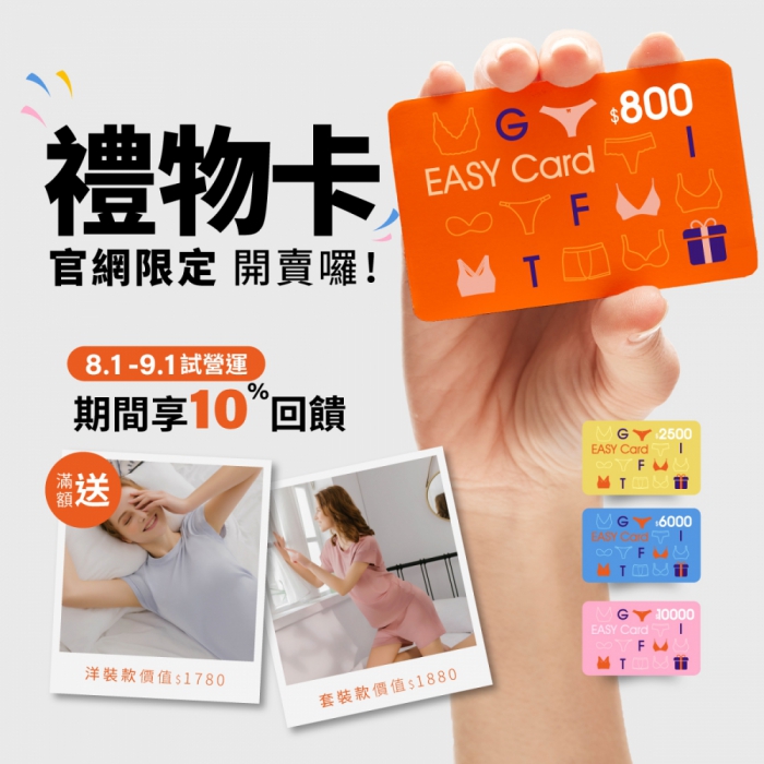 林怡君說,自8月1日起,官網推出「EASY Card電子禮物卡」,共有800、2500、6000、10000元四種面額,即日至9月1日止,購買面額6000元以上的即享10%回饋,再送Audrey_α森眠衣,不論把禮物卡扣打留給自己週年慶優惠購,還是買來送親朋好友,真的都很可以!