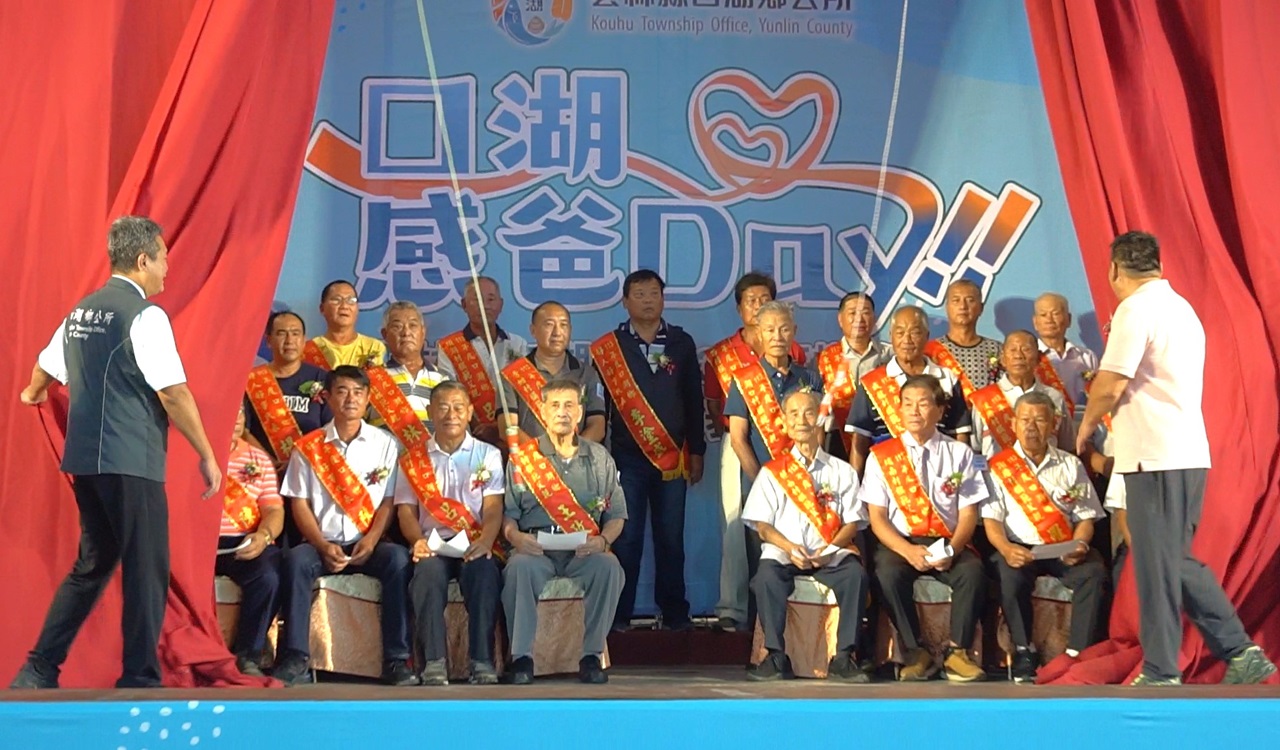 由鄉長李龍飛、口湖鄉代表會主席王溪邊將舞台布幕緩緩拉開,全體獲獎之模範父親及好人好事代表於舞台上一字排開。