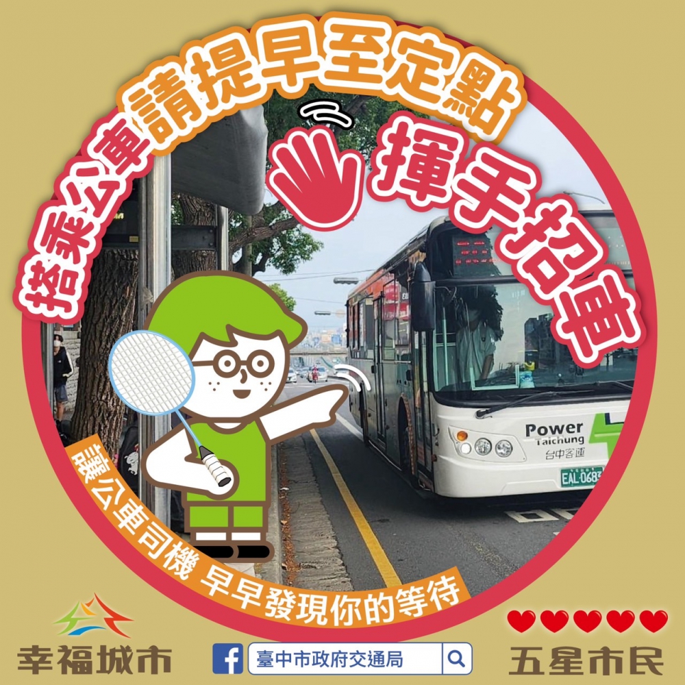 葉昭甫指出,公車禮貌運動突顯台中的公車品牌價值,公車駕駛身負乘客安全的重要責任,交通局也為公車的軟硬體優化更多便利設施,如建置黃色笑臉鈴鐺圖案服務燈的候車亭,至今年6月已達1080座,搭車時不必站到候車亭外提前招手,透過按服務燈讓將進站的駕駛提早知道,等候公車時不低頭滑手機,駕駛更容易看見乘客,順利搭上要搭的班次。