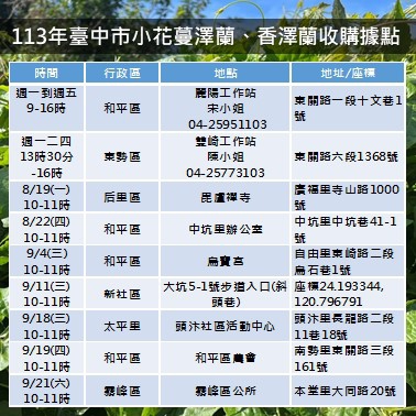 臺中分署表示,為降低入侵植物的危害,已在東勢區雙崎工作站及和平區麗陽工作站設置小花蔓澤蘭及香澤蘭常駐收購點,全年皆有收購服務,為服務臺中其他區域民眾,今年更加開場次,分別於8月19日后里區毘盧禪寺、8月22日和平區中坑里辧公室、9月4日和平區烏寶宮、9月11日新社區大坑5-1步道入口、9月18日太平區頭汴社區活動中心、9月19日和平區農會及霧峰區公所9月21日上午10點至11點加開收購場次,請民眾詳閱各收購點的時間地點,以免撲空。