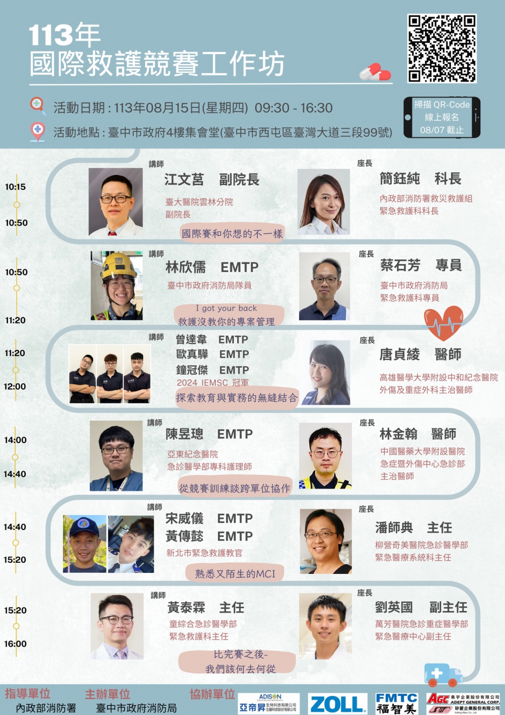 工作坊包含「後勤團隊的專案管理」、「從競賽訓練談跨單位協作」、「大量傷病患的現場應變處置」等主題,並邀請國際賽評審與出題醫師,分享他們對國際競賽的見解,2024年ICEMS國際競賽前3名的隊伍也現身說法,講述他們如何將比賽中的經驗應用於實際勤務,以及後勤團隊的支持對於比賽隊伍至關重要。