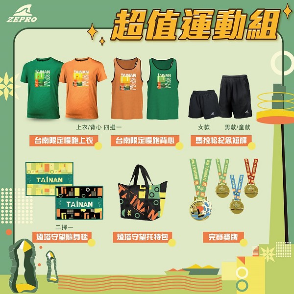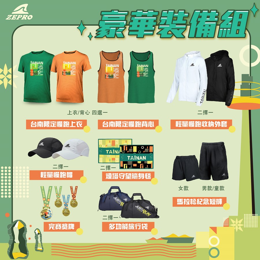 參賽者將獲得豐富的路跑物資,根據報名的組別不同可獲得吸濕排汗慢跑上衣或背心、馬拉松紀念短褲、燈塔守望幾何隨身毯和托特包、輕量透氣慢跑帽、輕量慢跑收納外套、Just Run多功能旅行袋,以及獨特的燈塔與浪花浮雕完賽獎牌。