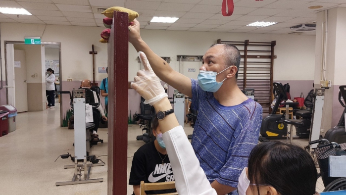 阿福整理情緒再出發,從練習坐立、移位、投擲及拿取等基本復健動作,直到出院時能恢復站立,阿福的太太表示,先生自倒下後,整整昏迷了一個半月才清醒,從清醒後的拔管,呼吸訓練與復健到恢復站立,一步一腳印,這段期間感謝醫療團隊的幫忙,看護的協助及許多人伸出援手 。