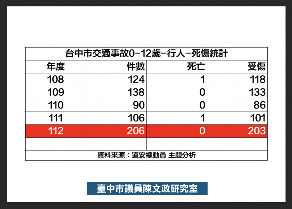 【記者林獻元台中報導】「孩子走在路上被撞,是最讓人無法接受的事故」,國民黨台中市議員陳文政20日在台中市議會第4屆第4次臨時會提出質詢說,112年台中行人、普通重型機車死傷數,高居六都第一,其中又以年齡區段以「12歲以下」增幅最明顯,行人死傷數高達206件,相比前一年度增加近1倍,孩童行走安全已亮起紅燈,呼籲市府交通局即刻檢討。