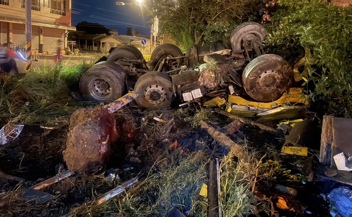 雲林縣四湖鄉發生一起嚴重車禍,一輛大貨車於台17線(中華路)與文化路路口處翻覆,造成3名男子受困車內,情況十分危急。(圖/四湖消防分隊提供)