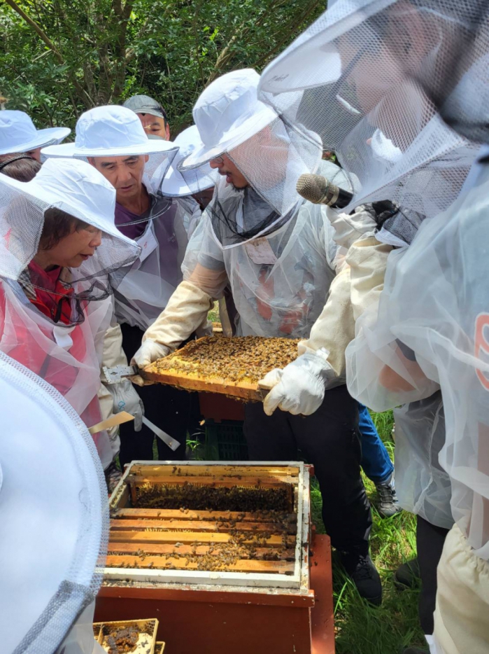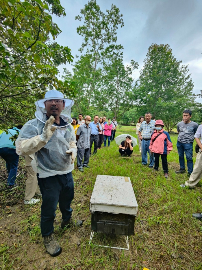 在實作示範區設置27個蜂箱,由學員每周定期查蜂,觀察蜂量、花粉、花蜜情形及除蟎處理並做成紀錄,另由林業試驗所指導學員實際栽植50株天仙果,了解栽植過程及應注意事項。