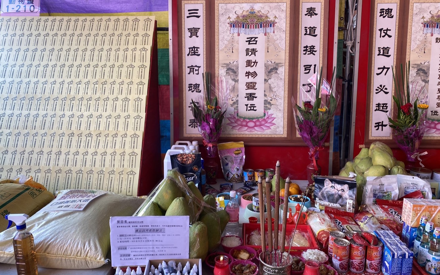 今年的蘭盆勝會也設立「召請動物靈香位」的「動物普度」,有雲林口湖、大埤、二崙等地的虔誠信眾敬備犬貓、雞隻、天竺鼠、養殖鰻魚之飼料與保健品贊普。(圖/記者蘇峰毅攝)