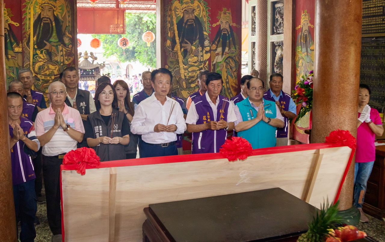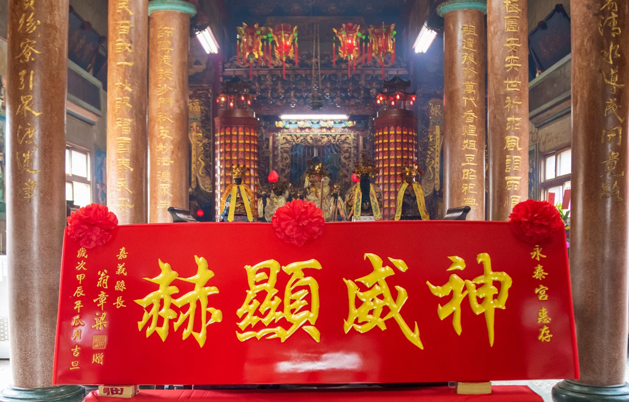 鹿草鄉永泰宮主祀神明法主公聖君,今農曆7月23日聖誕千秋,縣長翁章梁致贈「神威顯赫」匾額。