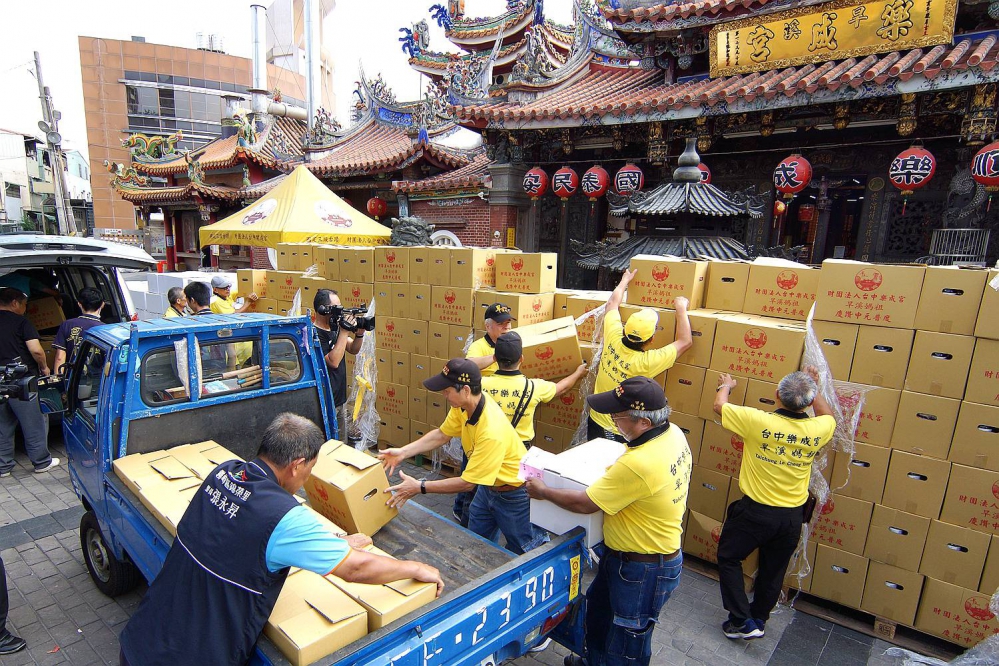 何敏誠指出,今年樂成宮普桌共計5427桌,其中近3千桌供品民眾慷慨捐出,加上今年募集愛心白米5萬5千多斤,受贈對象來自台中市東區17個里之里民及全國各地方58處社福機構、旱溪媽祖遶境十八庄轄內相關11個行政區之里與太平區、烏日區、大里區、霧峰區102個里加東區17個里等,還有弱勢家庭及關懷據點,每箱物品價值1500元,包括有沙拉油、白米、泡麵、罐頭、餅乾與飲料等生活物資20項食物,共捐出普品3500箱、白米55000斤。