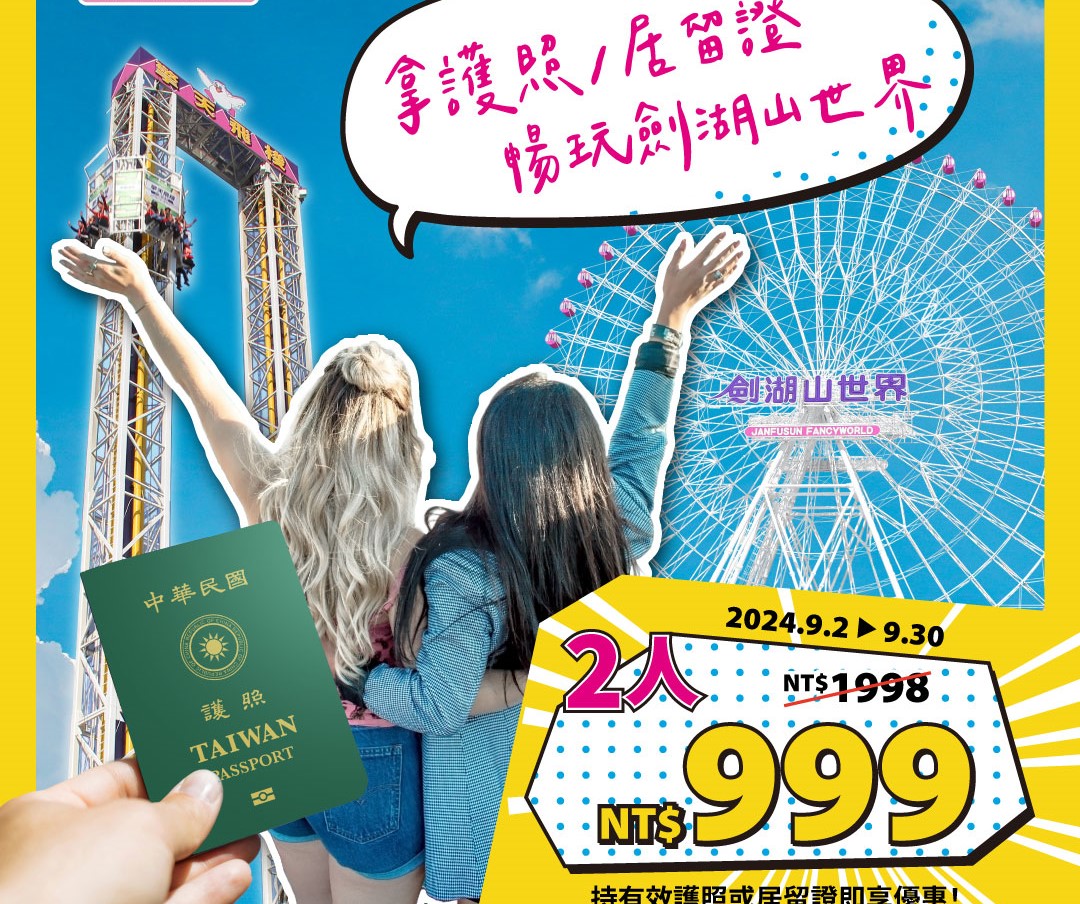 劍湖山世界經理張華紋表示,九月天氣涼爽,非常適合出遊。為了歡迎國內外的遊客,9月2日至9月30日期間,劍湖山世界特別推出憑「護照」或「居留證」購票的國際友人優惠,兩人同行只需999元。此外,憑大專院校學生證購票的大學生,也可享同樣的優惠,詳情可參閱劍湖山世界官網。